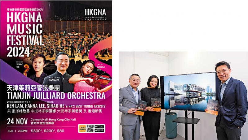 左图:天津茱莉亚管弦乐团将于11月24日晚在香港大会堂音乐厅举行音乐会。右图:林敬基(左起)、李汉娜、何为接受访问。\大公文汇全媒体记者万霜灵摄