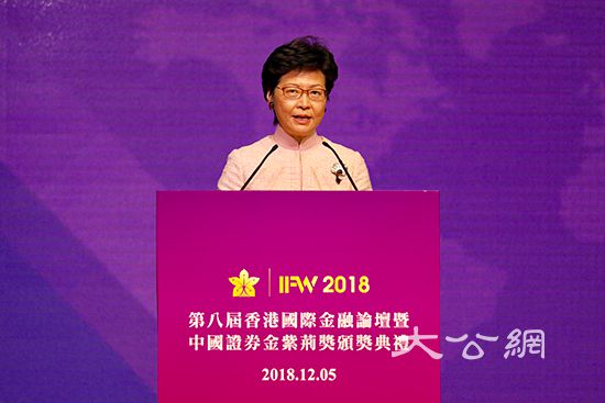 2018年12月5日,备受瞩目的第八届香港国际金融论坛暨中国证券金紫荆奖颁奖典礼在香港隆重举行。论坛以“中国力量--改革开放再出发”为主题,吸引了近百家内地和香港大、中型上市公司的高管以及香港政商界名流等约800位嘉宾与会并致辞。香港特别行政区行政长官林郑月娥出席并致辞。