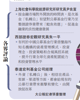 西部证券宏观研究员朱一平则指出,外资私募试水私转公,有利于丰富资本市场机构投资者类型,加深中国资本市场对外开放的广度和深度,符合中国金融供给侧结构性改革的主要方向。有利于中国公募基金行业借鉴海外知名机构的资产管理模式、投资理念、投资策略和合规风控系统,提升行业全球化资产配置能力和投资管理水平。