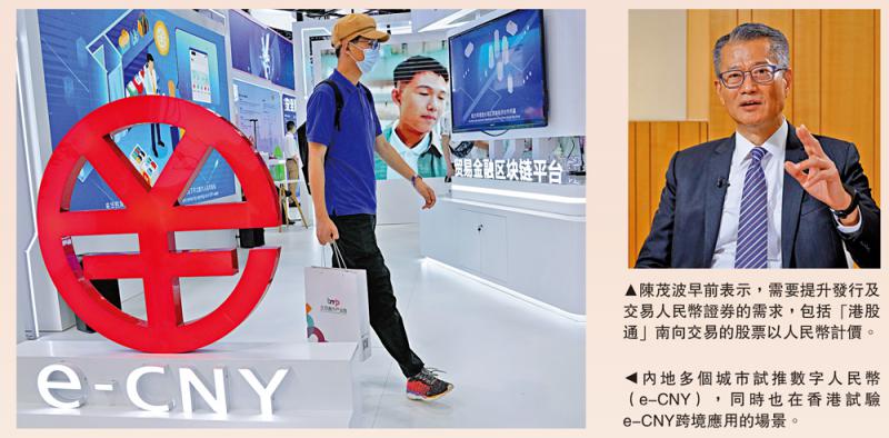图左:内地多个城市试推数字人民币(e-CNY),同时也在香港试验e-CNY跨境应用的场景。图右:茂波早前表示,需要提升发行及交易人民币证券的需求,包括“港股通”南向交易的股票以人民币计价。