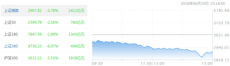 今天(19日)是端午节后开市首日,因受到节日期间中美贸易战情绪发酵影响,A股三大股指开盘后集体大幅低开,沪指击穿3000点,盘中更是一度失守2900点关口。盘上面再现千股跌停惨烈景象,仅银行、保险相对抗跌,另外反关税概念股顽强上涨。截至收盘,上证综指下跌3.78%报2907.82点,创23个月来新低,并创逾四个月最大单日跌幅。深成指跌5.31%报9414.76点,创业板指跌5.76%报1547.15点,亦为2015年1月以来新低。两市成交小幅放大,共3959亿元(人民币,下同),其中沪市成交额2412亿,深市成交额2325亿。