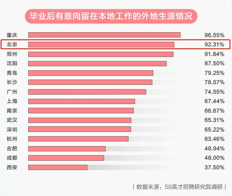 在上述报告提及的非本地户籍人口中,外地生源毕业生是重要群体。据58集团发布的《2018高校毕业生就业安居报告》,北京高校的外地生源毕业生中,有留京工作意愿的毕业生人数占所有外地生源毕业生的92.31%,排名居前三位。贝壳研究院认为,因外地生源毕业生留京工作而产生的租赁需求在毕业季集中释放,房东预期因此增强,租金面临上涨压力。