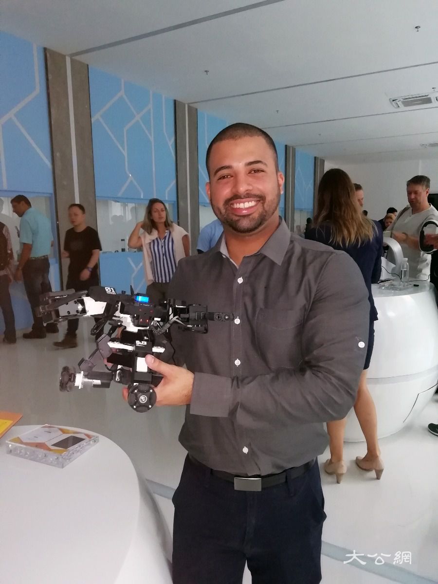 而小巧的智能折叠电动车可以缩放自如,可以1秒快速折叠、App手机互联、车身重仅12.6公斤等,并且方便续航,可以更换电池组,目前该款产品也获得了大量海外订单。巴拿马客商手里拿着竞技机器人,爱不释手。该机器人底盘有四个全向轮可以多维度转向,内置精准计分传感器,可以App操控。