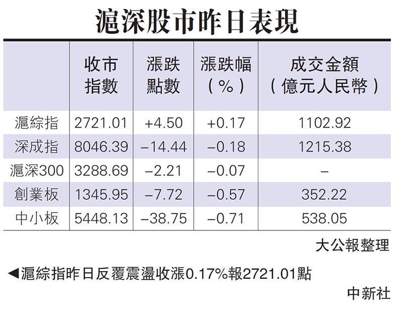 A股疲弱,沪综指反复震荡收市微涨0.17%报2721.01点;深成指及创业板指初段冲高后持续下探,创业板指盘中曾跌逾1%至1338点,创2014年8月以来的逾四年新低,最后收跌0.57%报1345.95点,深成指亦收跌0.18%。外资通过沪深股通连续第二日净流出,流出规模近30亿元(人民币,下同)。两市昨日合计成交2318.31亿元,较上一交易日的2889.46亿元明显缩量19.7%。