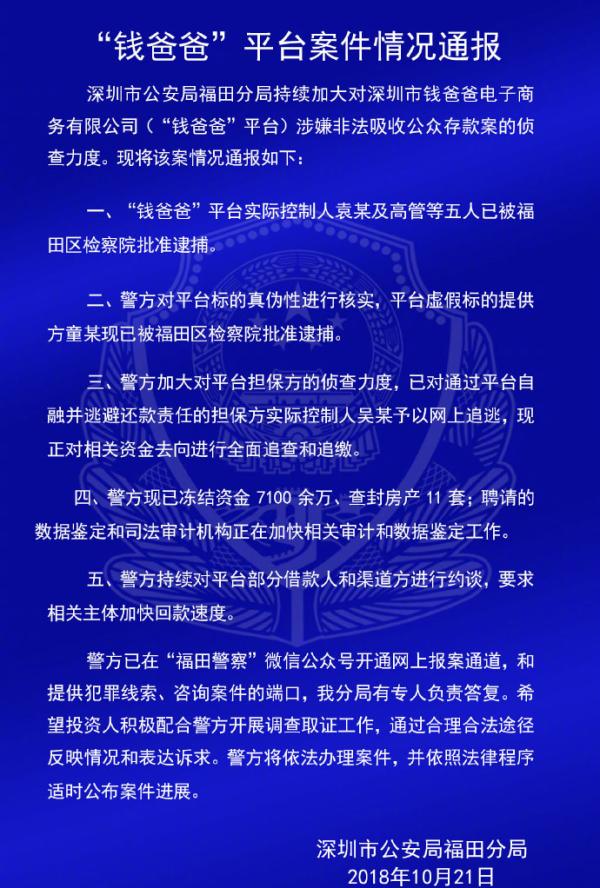 深圳警方通报7家P2P案情:冻结钱爸爸7100万资金