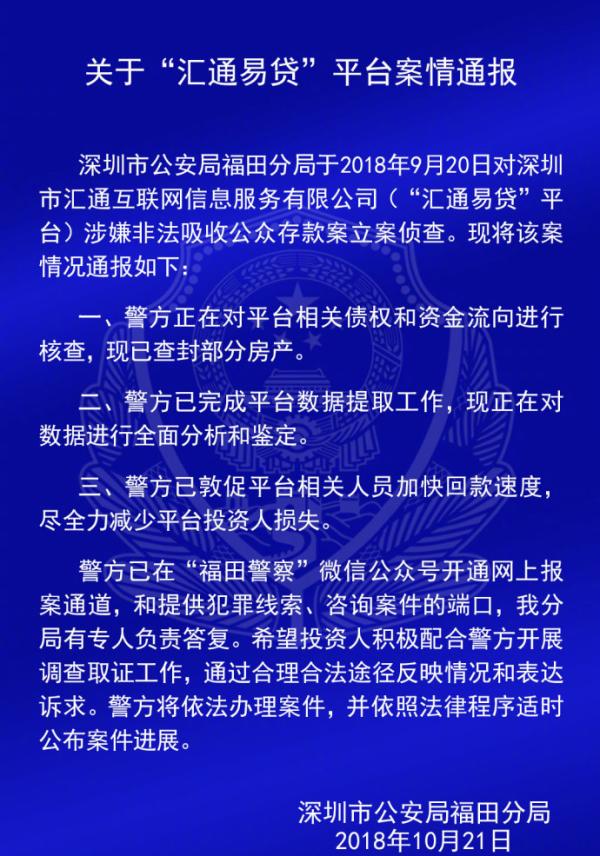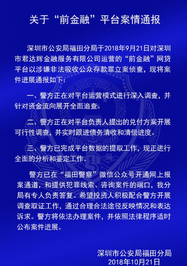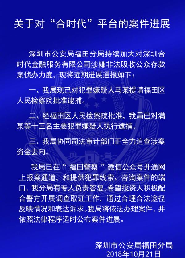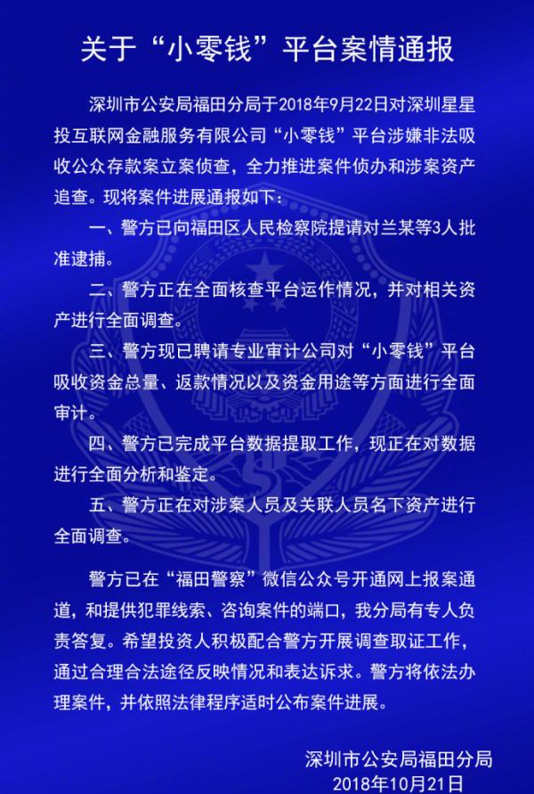 @深圳公安10月21日消息,10月21日,深圳福田警方对“钱爸爸”、“小零钱”、“前金融”、“合拍在线”、“汇通易贷”、“财富中国”和“合时代”等7家涉嫌非法集资犯罪的P2P平台案件情况进行通报。