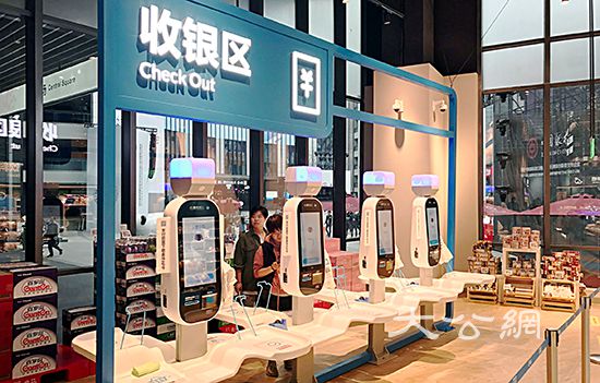 图:“盒马”已将各类进口生鲜商品搬入“进博会”展馆现场,图为“盒马”进博会体验店智能收银区。/记者 倪巍晨摄