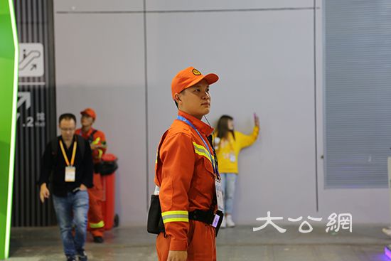 消防员仔细查看各个展台安全情况/记者孔雯琼摄