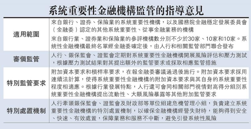 一行两会(中国人行、银保监会、证监会)昨日联合发布《关于完善系统重要性金融机构监管的指导意见》,明确通过对制定特别监管要求和建立系统重要金融机构特别处置机制两条途径,完善金融机构监管,防范系统重要性金融机构包括“大而不能倒”的系统性风险。专家认为,《指导意见》是防范化解金融风险的重要措施,也是中国金融监管体制改革的重要内容。