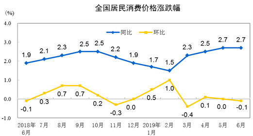 据国家统计局7月10日消息,2019年6月份,全国居民消费价格同比上涨2.7%。其中,城市和农村均上涨2.7%;食品价格上涨8.3%,非食品价格上涨1.4%;消费品价格上涨3.2%,服务价格上涨1.8%。上半年,全国居民消费价格比去年同期上涨2.2%。