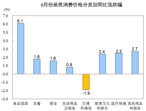 6月份,食品烟酒价格同比上涨6.1%,影响CPI(居民消费价格指数)上涨约1.79个百分点。其中,鲜果价格上涨42.7%,影响CPI上涨约0.71个百分点;畜肉类价格上涨14.4%,影响CPI上涨约0.59个百分点(猪肉价格上涨21.1%,影响CPI上涨约0.45个百分点);禽肉类价格上涨7.4%,影响CPI上涨约0.09个百分点;鸡蛋价格上涨6.1%,影响CPI上涨约0.03个百分点;鲜菜价格上涨4.2%,影响CPI上涨约0.10个百分点;粮食价格上涨0.6%,影响CPI上涨约0.01个百分点;水产品价格下降0.5%,影响CPI下降约0.01个百分点。