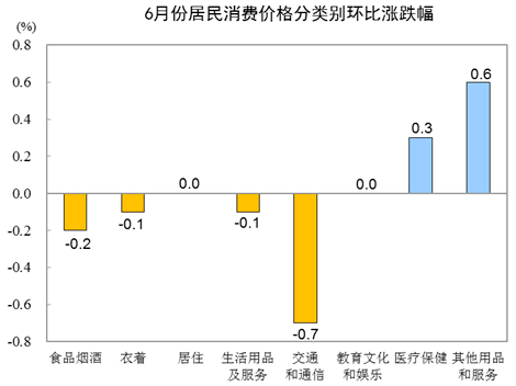 6月份,全国居民消费价格环比下降0.1%。其中,城市下降0.1%,农村下降0.2%;食品价格下降0.3%,非食品价格下降0.1%;消费品价格下降0.2%,服务价格上涨0.1%。