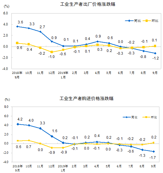 据国家统计局15日消息,2019年9月份,全国工业生产者出厂价格同比下降1.2%,环比上涨0.1%;工业生产者购进价格同比下降1.7%,环比上涨0.2%。1—9月平均,工业生产者出厂价格与去年同期持平,工业生产者购进价格下降0.3%。