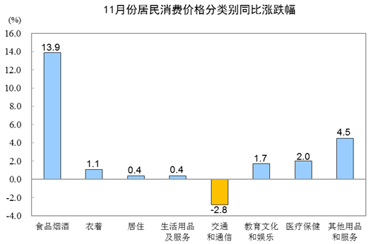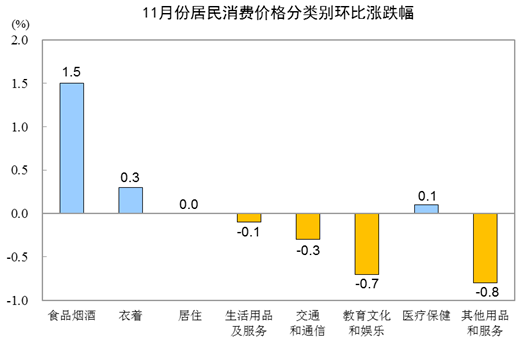 11月份,全国居民消费价格环比上涨0.4%。其中,城市上涨0.3%,农村上涨0.5%;食品价格上涨1.8%,非食品价格持平;消费品价格上涨0.8%,服务价格下降0.4%。