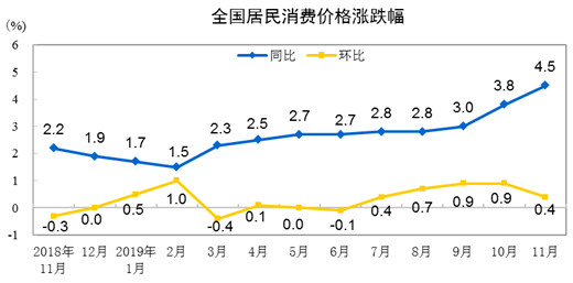 国家统计局表示,2019年11月份,全国居民消费价格同比上涨4.5%。其中,城市上涨4.2%,农村上涨5.5%;食品价格上涨19.1%,非食品价格上涨1.0%;消费品价格上涨6.5%,服务价格上涨1.2%。1--—11月平均,全国居民消费价格比去年同期上涨2.8%。