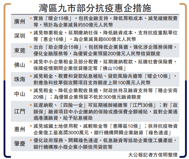针对疫情下企业面临的困境,湾区各市纷纷推出惠企政策,围绕扶持中小微企业、稳定外贸出口及降低融资等多个维度展开。措施以免租金、减税收、金融扶持等方面“主打”。其中,广州“暖企15条”预计为企业减负约50亿元(人民币,下同),涵盖餐饮、商贸、交通等受疫情冲击较大的行业、企业和个体户。东莞的撑企措施侧重于金融领域,为受疫情影响的优质企业预留200亿元信贷额度,综合贷款利率较去年同期融资成本下浮10%,对受疫情影响较大行业的贷款投放增长10%以上。