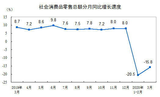 据国家统计局网站17日消息,3月份,社会消费品零售总额26450亿元,同比下降15.8%(扣除价格因素实际下降18.1%,以下除特殊说明外均为名义增长),降幅比1—2月份收窄4.7个百分点。其中,除汽车以外的消费品零售额23841亿元,下降15.6%。