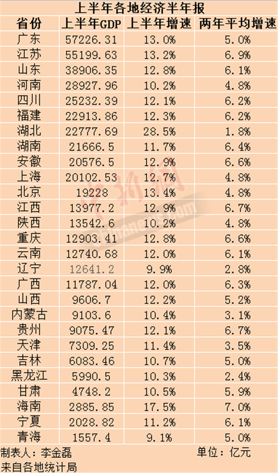 跟全国上半年12.7%的经济增速相比,湖北、海南、北京、江苏、广东、安徽、江西、山东、重庆这9个省份的上半年经济增速跑赢全国。