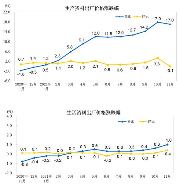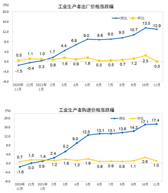 据国家统计局网站消息,2021年11月份,全国工业生产者出厂价格同比上涨12.9%,环比持平;工业生产者购进价格同比上涨17.4%,环比上涨1.0%。1—11月平均,工业生产者出厂价格比去年同期上涨7.9%,工业生产者购进价格上涨10.7%。