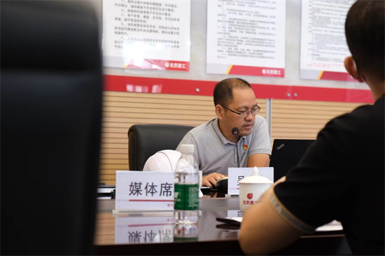 北京建工项目经理吴良良介绍北京城市副中心剧院项目(大公网实习记者张晚凝摄)