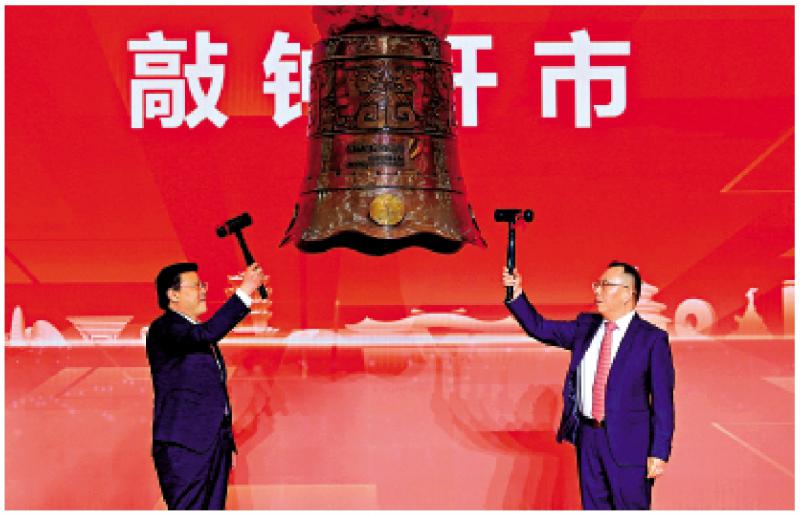 图:广东省委副书记、深圳市委书记孟凡利(左)和深圳证券交易所理事长陈华平进行敲钟仪式。