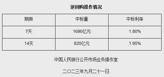 据央行网站21日消息,为维护季末流动性平稳,2023年9月21日人民银行以利率招标方式开展了2510亿元7天期和14天期逆回购操作。具体情况如下:
