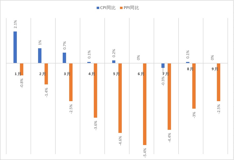 国家统计局数据显示,9月CPI(全国居民消费价格)同比由8月上涨0.1%转为持平,CPI环比上涨0.2%,涨幅较前值回落0.1个百分点。当月,PPI(工业生产者出厂价格)同比下降2.5%,降幅较8月收窄0.5个百分点,连续三个月改善;PPI环比上涨0.4%,涨幅较前值扩大0.2个百分点。至此,首三季度CPI同比上涨0.4%,PPI同比下降3.1%。国家统计局城市司首席统计师董莉娟介绍,得益于消费市场的持续恢复,CPI环比继续上涨,但受上年同期高基数影响,CPI同比“由涨转平”。分析称,上月内地通胀延续改善态势,进一步增强了市场对物价企稳回升的信心,反映市场供需正朝着平衡方向修复,本季物价增速大概率将企稳回升。