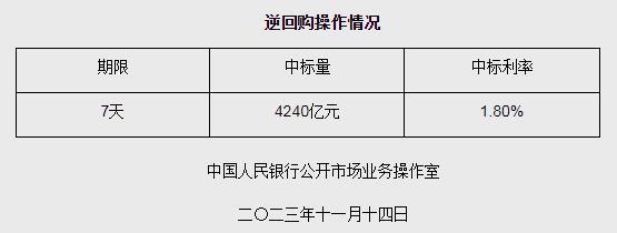 据央行网站消息,为维护银行体系流动性合理充裕,2023年11月14日人民银行以利率招标方式开展了4240亿元逆回购操作,中标利率1.80%,期限为7天。