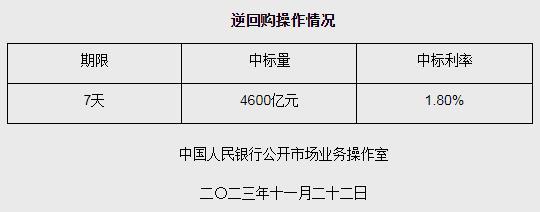 据央行网站消息,为维护银行体系流动性合理充裕,2023年11月22日人民银行以利率招标方式开展了4600亿元逆回购操作,中标利率1.80%,期限为7天。具体情况如下: