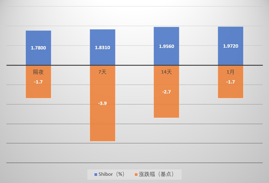 周一上海银行间同业拆放市场(Shibor)各短期品种变动情况 / 记者倪巍晨制图
