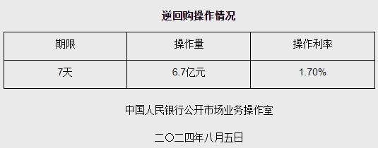 据央行网站消息,为维护银行体系流动性合理充裕,2024年8月5日人民银行以固定利率、数量招标方式开展了6.7亿元逆回购操作。具体情况如下: