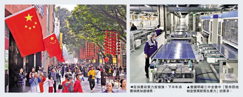 左图:促消费政策力度增强,下半年消费端将加速增长。右图:会议明确三中全会中“坚持因地制宜发展新质生产力”的要求。