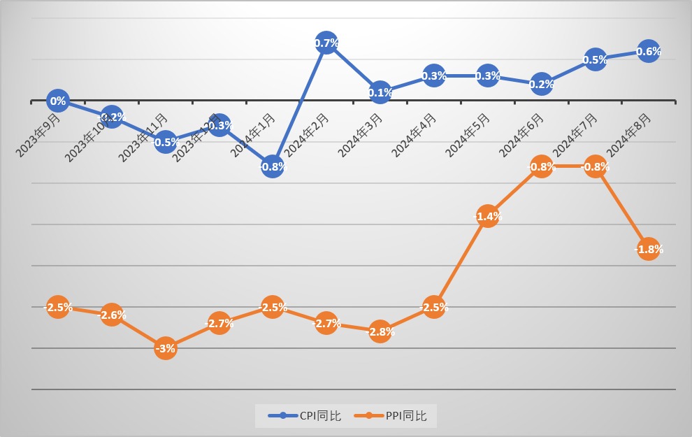 国家统计局数据显示,8月全国居民消费价格(CPI)同比上涨0.6%,较前值提升0.1个百分点,涨幅连续两个月向上改善,并创今年3月以来新高;CPI环比上涨0.4%,涨幅较前值回落0.1个百分点。当月,全国工业生产者出厂价格(PPI)同比下降1.8%,降幅较前值扩大1个百分点,为四个月来新低;PPI环比下降0.7%,降幅扩大0.5个百分点。分析称,供需状况改善、节日效应及局部地区异常天气等,是CPI同比涨幅扩大的主因。鉴于前期刺激消费和内需政策效果的显现、传统消费旺季的到来,以及上年同期基数的回落,下半年CPI同比料续温和回升。