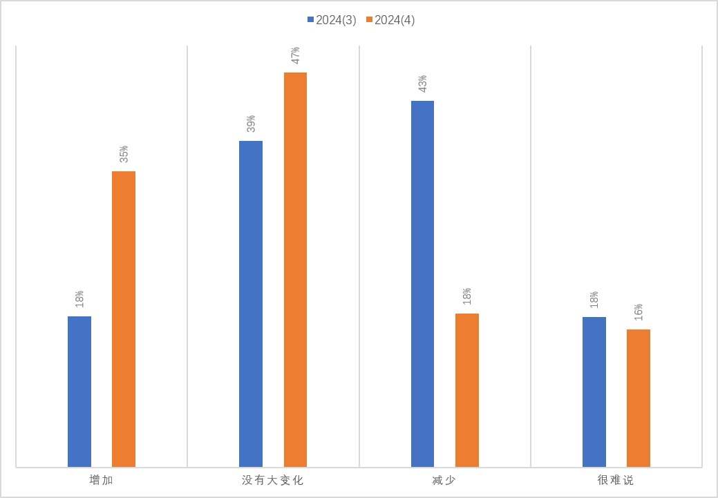 谈及“股票投资额度是否增加”的话题时,表示“增加很多”的机构占比从3%升至5%,表示“有些增加”的机构占比从5%升至26%,认为“没有变化”的机构占比从34%升至40%,表示“有些减少”的机构占比从33%降至20%,表示“减少很多”的机构占比从25%降至9%。