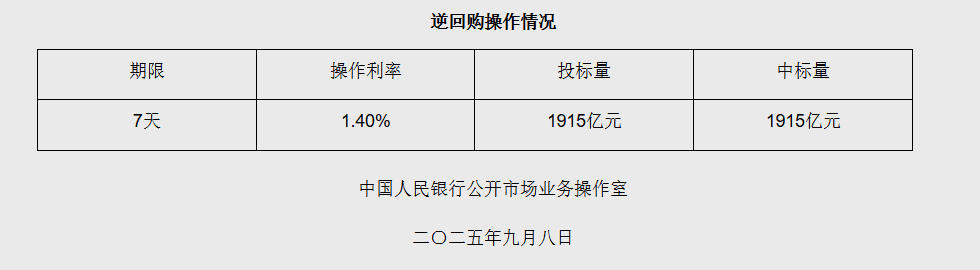 据央行网站消息,2025年9月8日中国人民银行以固定利率、数量招标方式开展了1915亿元逆回购操作。具体情况如下: