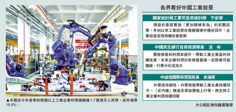 国家统计局数据显示,一季度全国规模以上工业企业利润总额录1.7万亿元(人民币,下同),按年增长15.5%,增速较首两月加快0.3个百分点。同期,企业营收按年增长5%至33.19万亿元,营收利润率按年提高0.46个百分点至5.11%,创2023年以来同期新高。3月单月,规模以上工业企业利润同比增长15.8%。