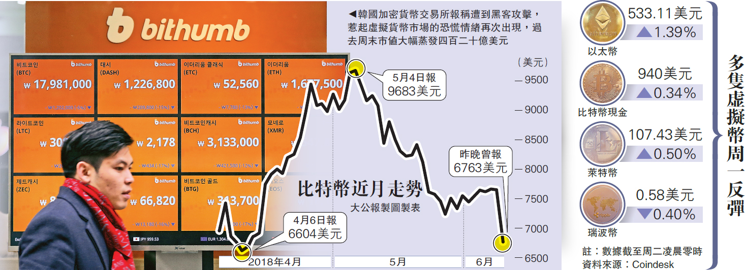 韩国加密货币交易所报称遭到黑客攻击,惹起虚拟货币市场的恐慌情绪再次出现,而随着虚拟货币今年的沽售加剧,整个市场在过去周末期间的市值大幅蒸发420亿美元(约3276亿港元)。比特币价格周日曾低见6693美元,其后周一回升至6763美元;其他虚拟货币包括以太币等于于周末期间的跌幅均超过11%,周一则回升。