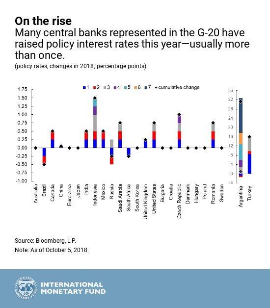 对于新兴市场和发展中经济体而言,包括阿根廷、巴西、南非以及土耳其在内,随着美国货币政策的逐步收紧,叠加贸易问题上的不确定性以及部分特殊因素,导致了资本流入受阻、货币走弱、股市疲软以及利率和利差受到抑制。