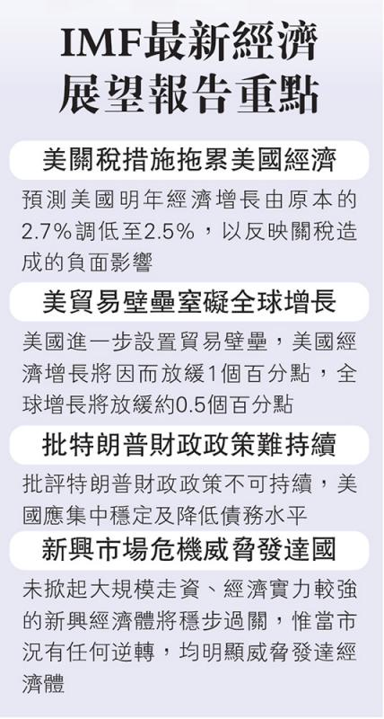 国际货币基金组织(IMF)罕有严厉地批评美国,认为美国加征贸易关税,对该国构成负面冲击,故下调美国明年经济增长预测,由原本的2.7%调低至2.5%,并警告美国的贸易关税政策,长远而言将导致美国经济增长及全球经济增长放缓。同时,IMF调低今明两年的全球经济增长预测,为逾两年以来首见,理由是贸易保护主义抬头及新兴市场波动所致。
