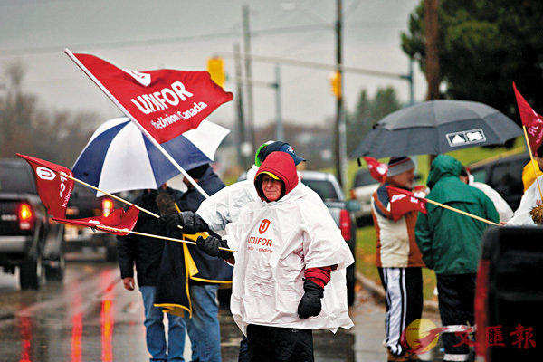 位于加拿大安大略省奥沙瓦的通用汽车工人,昨日发起罢工抗议。/路透社