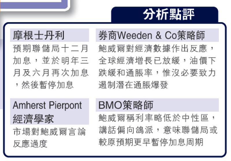 对于鲍威尔的“利率略低于中性水平”言论,分析师各有看法。美国投行摩根士丹利认为,鲍威尔的言论并非受到美国总统特朗普反对加息步伐言论的影响,预期联储局十二月将会决定加息,并于明年三月及六月再次出手,然后暂停加息。BMO策略师报告指出,鲍威尔表示利率略低于中性区间,意指联储局或较原本预期更早暂停加息周期,并认为他的讲话有点偏向鸽派。