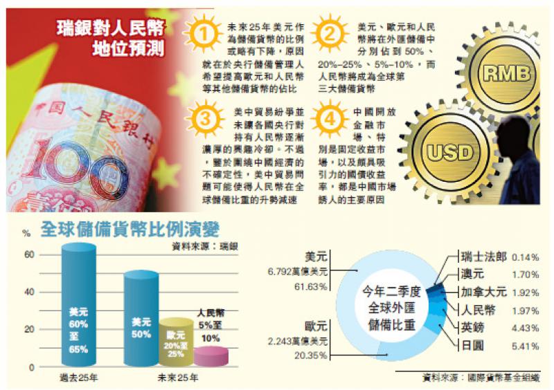 瑞银周三公布对主要央行等主权机构的调查显示,未来25年,美元仍将在全球储备货币中占主导地位,欧元和人民币在央行储备中的占比料进一步提升。报告又提到,人民币在未来将占全球储备货币最多一成,成为继美元和欧元后,第三大储币。数据显示,截至今年二季度,人民币占比排名第五位。\大公报记者 李耀华