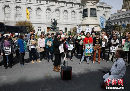 当地时间10月16日,旧金山民众在市政厅附近举行集会,抗议加州政府在化石燃料开采和使用方面的政策,呼吁人们关注气候变化,保护地球家园。中新社记者 刘关关 摄
