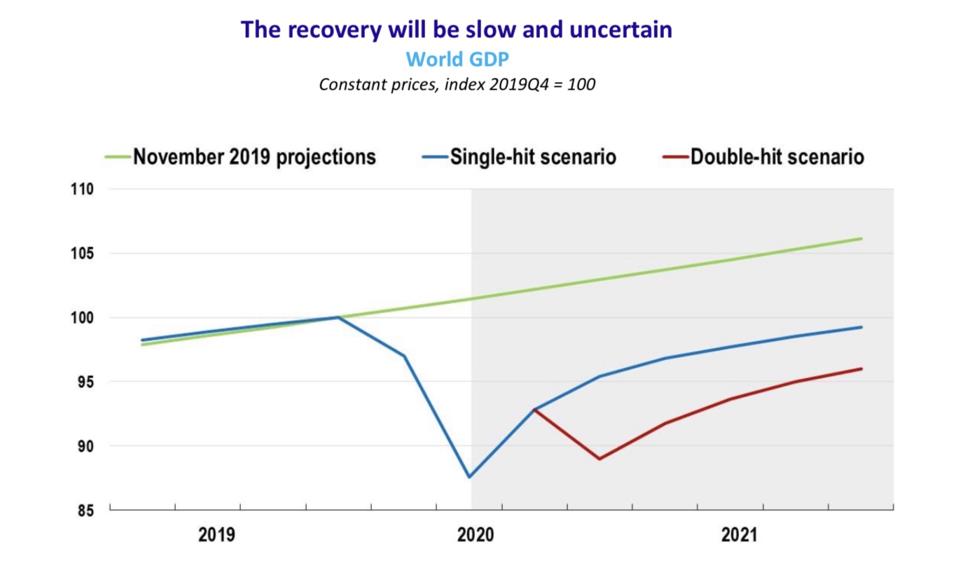 为此,经合组织在报告中也对全球经济增长做了两种不同情形的预测。如果在今年晚些时候出现第二拨疫情,预测全年经济将萎缩7.6%,直到2021年底也将难以恢复到疫情暴发之前的水平;如果能够避免疫情反弹,那么全年经济预计将减少6%,到2021年底或可恢复到危机之前的状态。