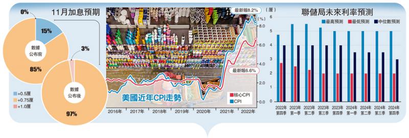 同时,芝加哥商品期货交易所的联储局观察工具亦反映出,金融市场几乎肯定11月加息0.75厘,更首次出现加1厘的预测,但比率只有3%。