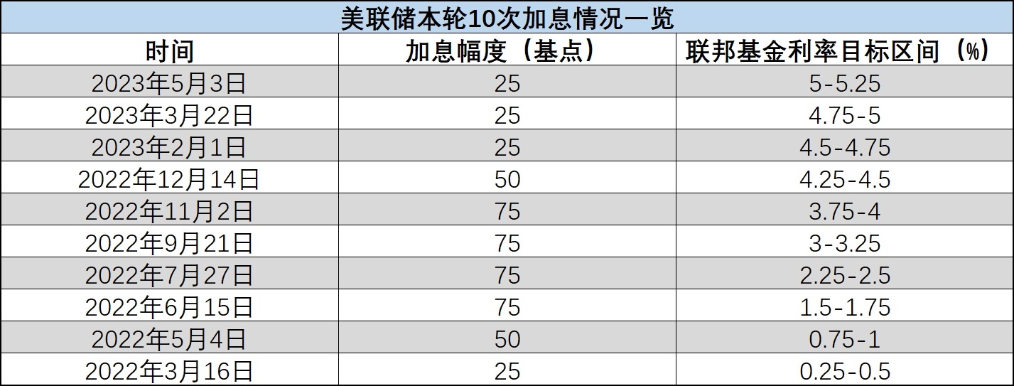 去年三月以来,美联储10次加息累计幅度达500个基点,市场人士相信,6月美国继续加息的可能性不大(大公网记者倪巍晨制表)