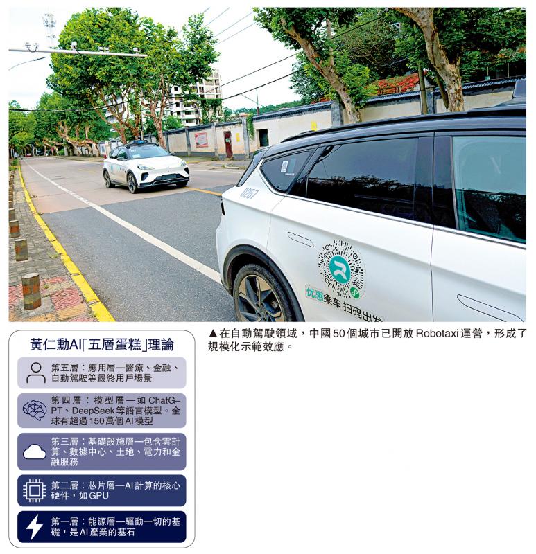 黄仁勳将AI产业生态比喻为一块“五层蛋糕”,每一层都构成了下一层发展的前提条件,形成“基础支撑─核心驱动─效率转化─智能赋能─价值落地”的闭环体系: