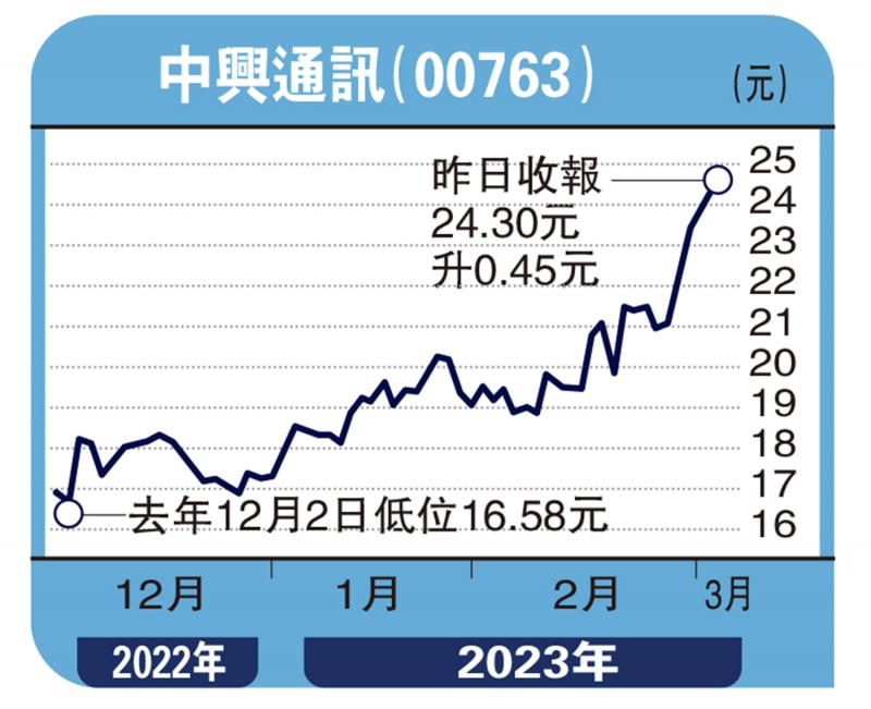 从技术走势分析,中兴通讯(00763)的股价走势漂亮,强于大市,回顾此股由去年第四季谷底的13.26元寻底,及至日前直奔25元之势,而且交投增、动力强,料本轮中期升浪的高点,会在年多前高位的31.4元以上水平出现。至于此股的10天及50天移动平均线,分别在21.6元及19.2元,是下线支持的参考指标。