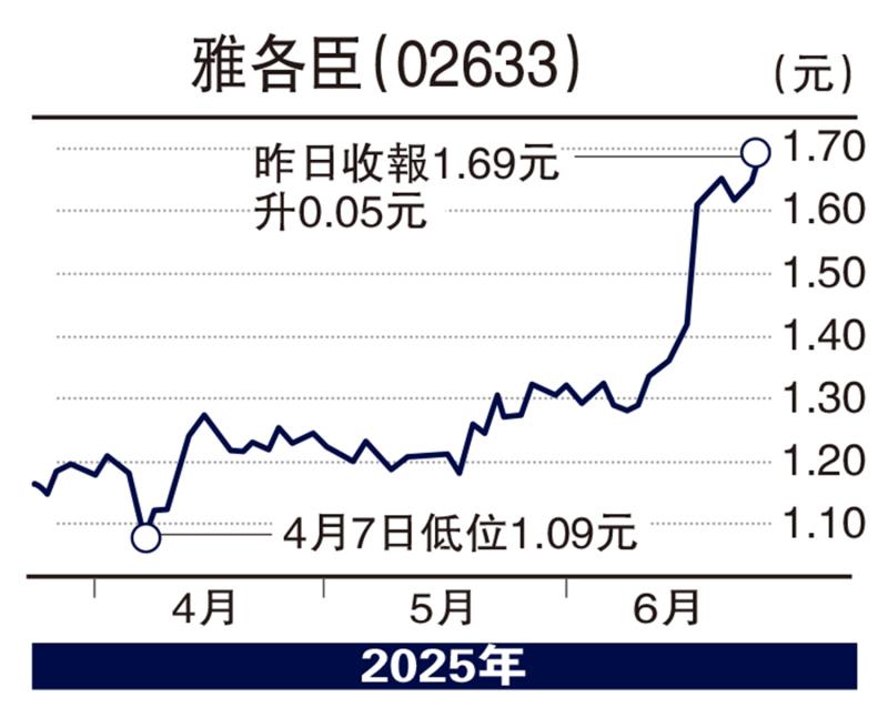 雅各臣股价在公布业绩后明显上升,创2020年以来高位,由于略见超买,可待回至1.6元买入,目标1.9元,跌破1.4元止蚀。该股昨日收报1.69元,升3%。