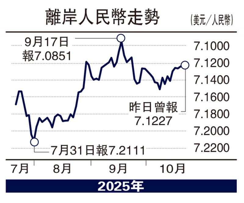 我们曾于9月3日本刊专栏提醒投资者,离岸人民币短线可入场以捕捉回升机会,兑美元初步目标价约7.12水平。期后,美元兑离岸人民币走势符合我们预期,于今年9月17日盘中更升见约7.0851水平。惟之后的一个月来,受美元小幅上扬影响,美元兑离岸人民币一度回升至7.1535,不过仍然未能成功突破50天线,执笔之时再度回落至7.12附近上落徘徊。